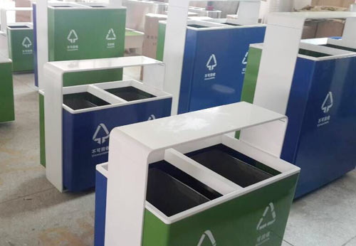 三、垃圾桶桶體的防腐抗蝕性能:這也是最重要的,畢竟戶外使用,風吹雨淋日曬,對桶體的傷害很大,此時產(chǎn)品的防腐抗蝕性能顯得特別突出重要 1、在制造胚體的過程中,就應該對鋼板進行除銹處理,再配化磷化工序,在表面生成一層磷化層,防銹防蝕性能大大提升; 2、桶體表面應使用靜電噴塑工藝,使用通過國家質量檢測的高端塑粉,既可將桶體的外觀顏色調配的光澤艷麗,又可對桶體里層鋼板起到保護作用,戶外長久使用,也不怕褪色開裂;