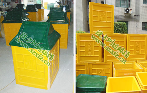 此款A02玻璃鋼屋形搖蓋垃圾桶規格為:500*500*1000mmm.我司欣方圳玻璃鋼垃圾桶采用優質玻璃纖維與進口樹脂著色合成,它強度高,耐腐蝕,耐酸堿,抗老化,太陽暴曬下不變形,抗紫外線,易清洗,操作方便,果皮箱收集容量大,堅固耐用使用壽命長,果皮桶無盜用和回收價值。潔凈、美觀、醒目、不退色。采用模具一次成型。密封性好,不污染環境。有的是鍍鋅板內膽”。我司常年大量生產玻璃鋼垃圾桶,現在這里分享一下,我們該如何去選擇一家玻璃鋼垃圾桶廠家呢?小編在此從以下幾個方面著手,公司的資質,公司的成立的時間,公司實地考察,生產產品的質量,產品的價格,交貨的日期等,這樣一大圈的走下來,眼見為實,耳聽為虛,誰家能勝任一一知曉。
