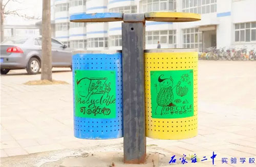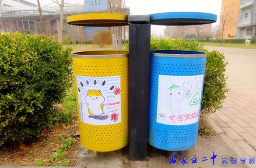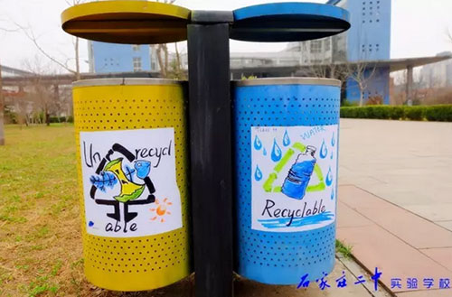 2016年3月18日,石家莊二中實驗學(xué)校2015級高一11班全體66名同學(xué)利用班級值周的時間,手繪百幅垃圾分類標(biāo)志,為校園垃圾桶換上了“新裝”。18日上午,高一11班教室內(nèi),66位同學(xué)拿起五顏六色的水彩筆,在紙張上設(shè)計出各種各樣的“垃圾分類”標(biāo)識和警示語,內(nèi)容涵蓋了分類標(biāo)志、垃圾擬人、科普漫畫等,圖面生動有趣。次日下午,同學(xué)們又從教室奔向校園每個角落,將精心繪制的圖案張貼在校內(nèi)所有的垃圾桶上,提醒過往師生將垃圾分類,維護(hù)我們共同的家園。