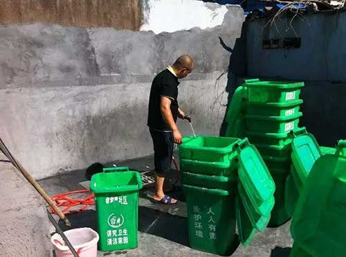 該垃圾桶清洗點選在小區廢棄操場的一角,原本被居民作為停車場,現在劃出10平方米鋪設排水管道,裝了壓水泵,還請了一名清潔人員專門負責清洗垃圾桶.接下去,金棉小區和虞家路農村片近200個垃圾桶,將三天“洗一次澡”。此外,眉山、陽明、金山等社區“洗澡池”也已“營業”。