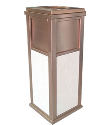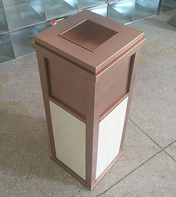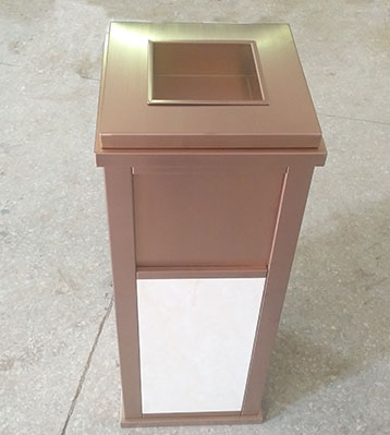 • 產品材質:高檔公寓鈦金垃圾桶采用天然的大理石與優質冷軋鋼板或不銹鋼鋼板制作而成,四面大理石用鋼板螺絲固定于桶體,有內桶,方便提倒垃圾,桶頭煙灰盅可放白石子可清洗,鋼板經折彎沖壓一次性成型。產品一律用室外粉靜電噴塑,經過180°的高溫,延長垃圾桶使用壽命,顏色持久不變亮麗如新。