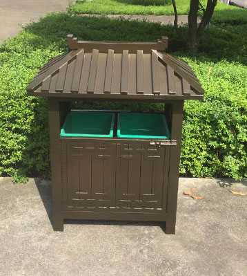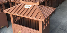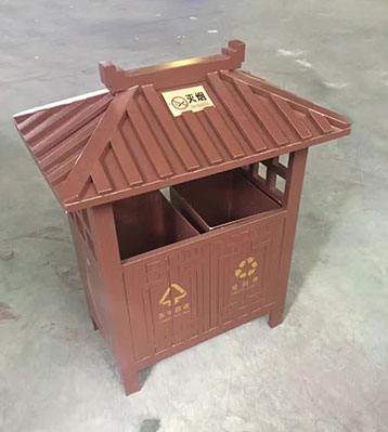 欣方圳景區(qū)仿古鋼制垃圾桶,桶頭部分屋檐造型,造型優(yōu)美、古色古香。