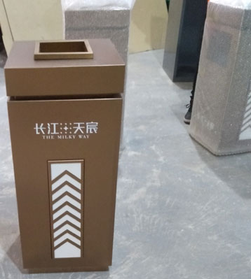 方形單桶設計用于樓盤瓜果紙屑作為果皮箱使用,兩面開口作為果皮垃圾投口,另兩面桶身上做裝飾效果,不銹鋼方形電鍍垃圾桶四面絲印樓盤LOGO。桶頭打開可取內桶收運垃圾,頂部嵌入煙灰盅放小石子滅煙和煙蒂收集使用,表面做電鍍效果高檔美觀!